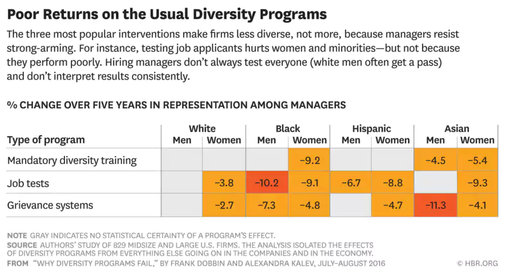 Further, the researches who performed that study, came to the conclusion that "In firms where training is mandatory or emphasizes the threat of lawsuits, training actually has negative effects on diversity."